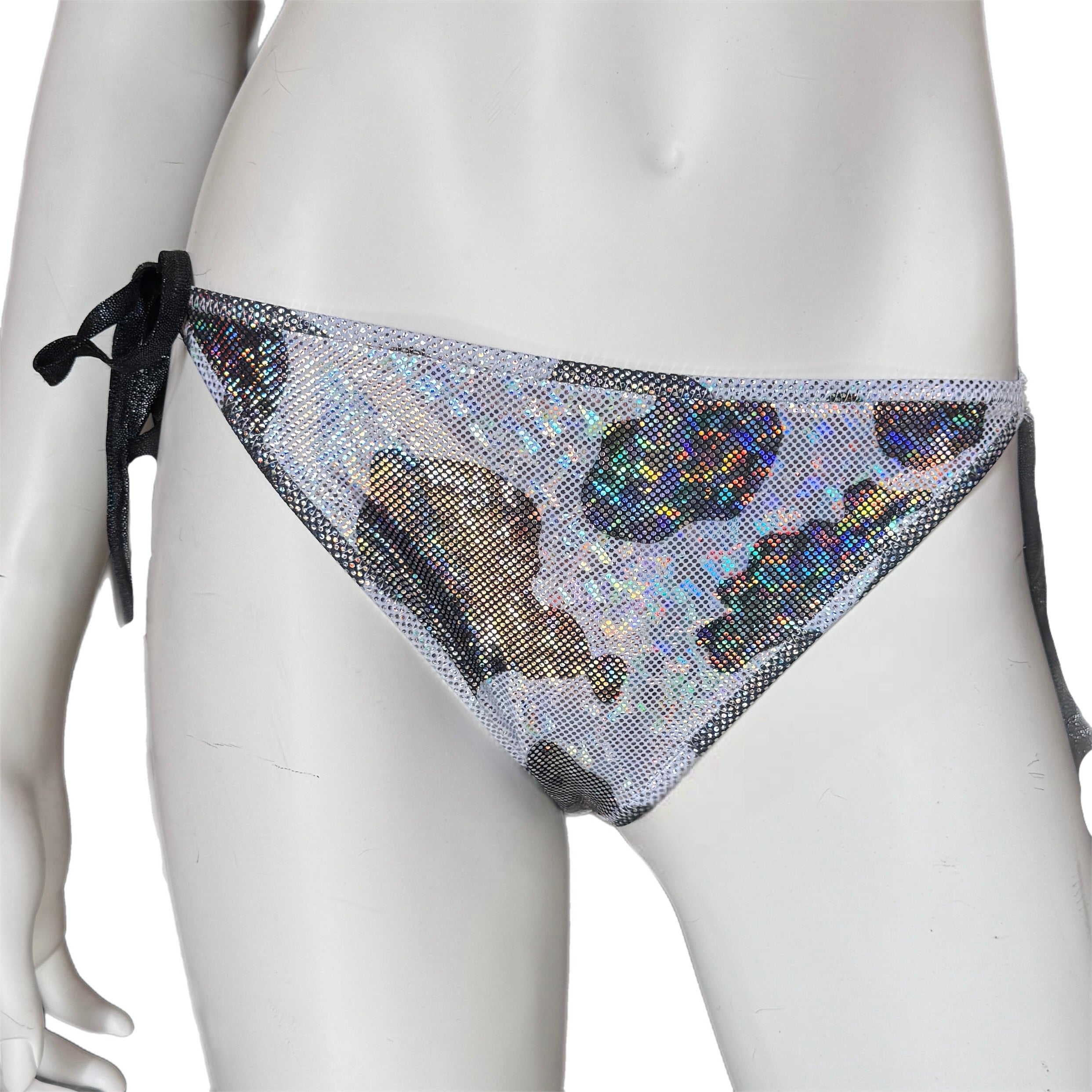 The Disco Cow Bikini Bottom is a black and white cow pattern printed on nylon spandex topped with a shattered glass holographic mystique. The fabric is designed to ensure you stay comfortable and dry no matter the activity and is designed to give you the most comfortable experience possible, with fabric that moves with you and maintains breathability and moisture management. This swim bottom is simply a lined side tie string bikini bottom, so it's adjustable if you want to size up or size down based on the desired coverage.