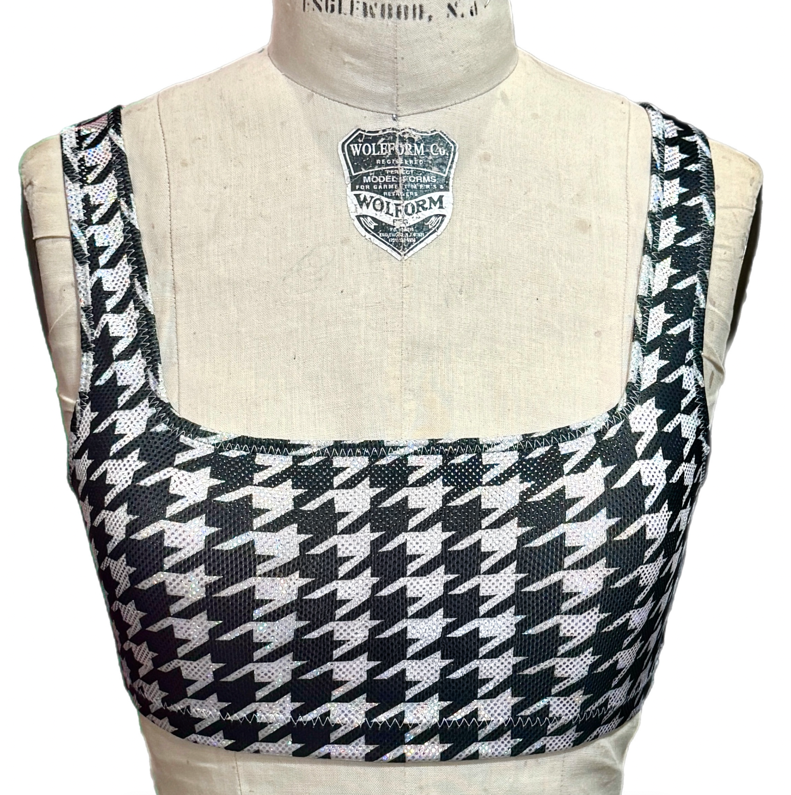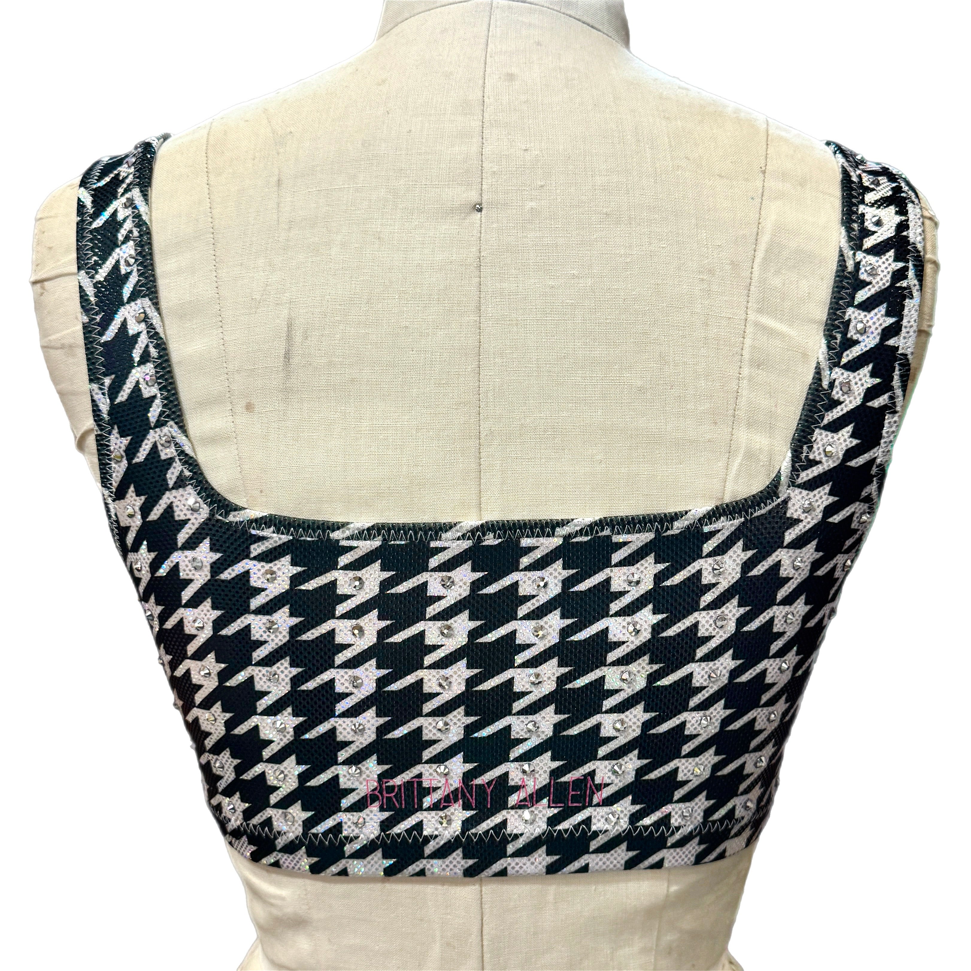 The Houndstooth Holographic Bra/Tank is made of a black and white houndstooth printed metallic spandex and is specifically designed to wick away moisture while keeping you cool. This bralette features an encased elastic waistband, fully lined interior, adjustable/ hidden reinforcment elastic shoulder ties for the strappy style, and coverstitching on the band seam to ensure no elastic twists and turns.