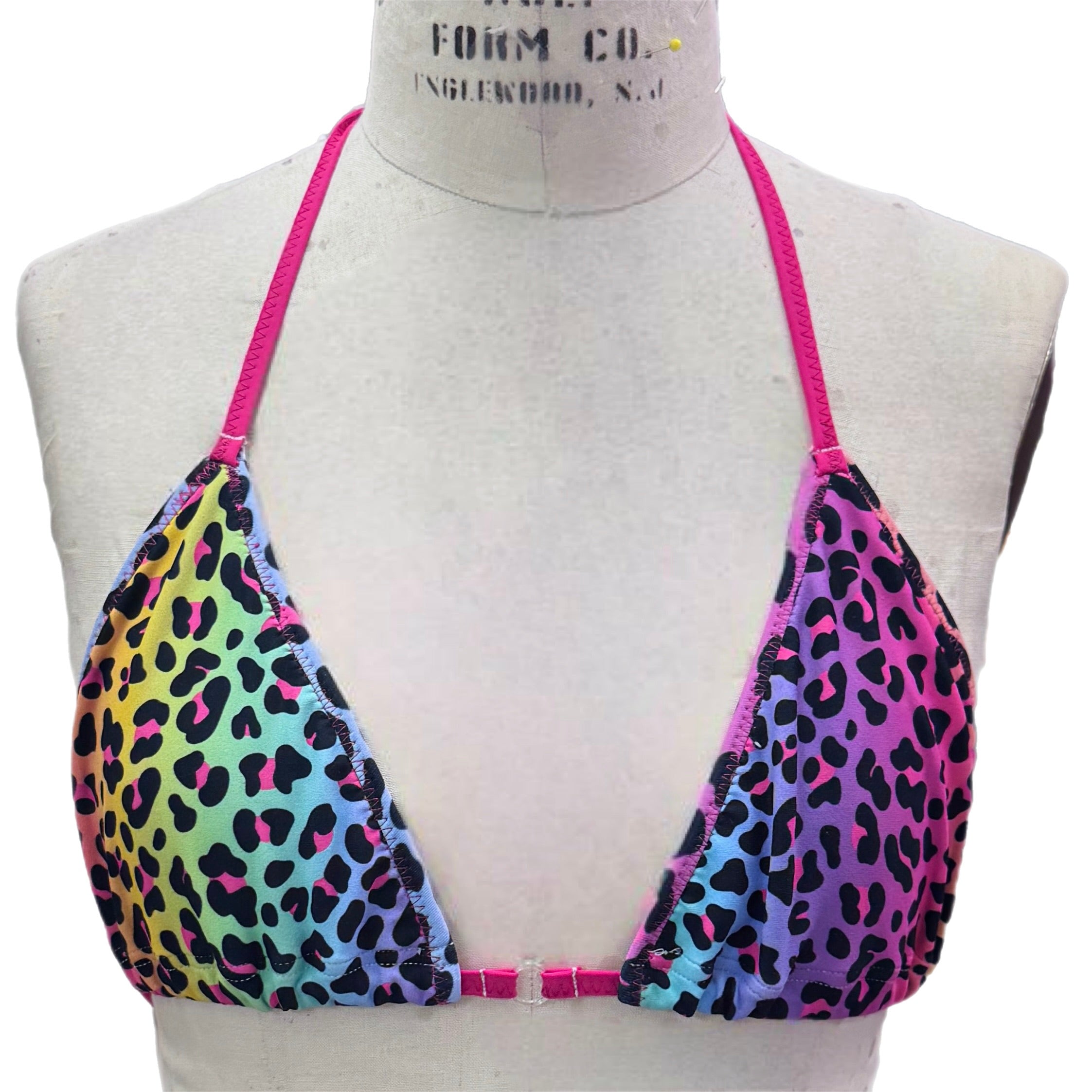 The Millennial String Bikini Top is made of a rainbow leopard printed matte spandex that is smooth and soft as butter. Designed to move with you, this fabric transforms any outfit into something extraordinary. Our bikini top is simply lined with our BA signature bubblegum pink spandex lining, adjustable tie bikini top and is essentially full coverage.