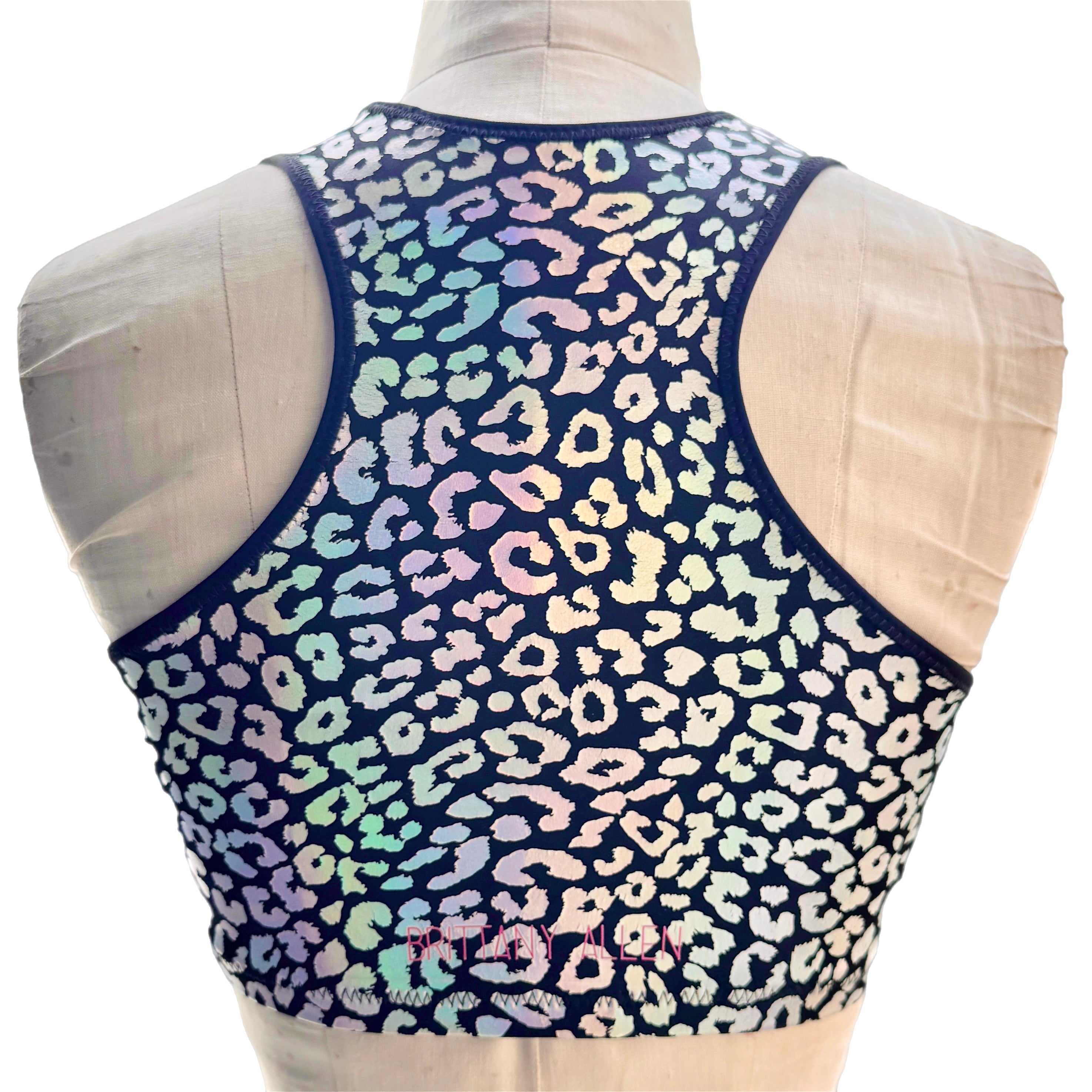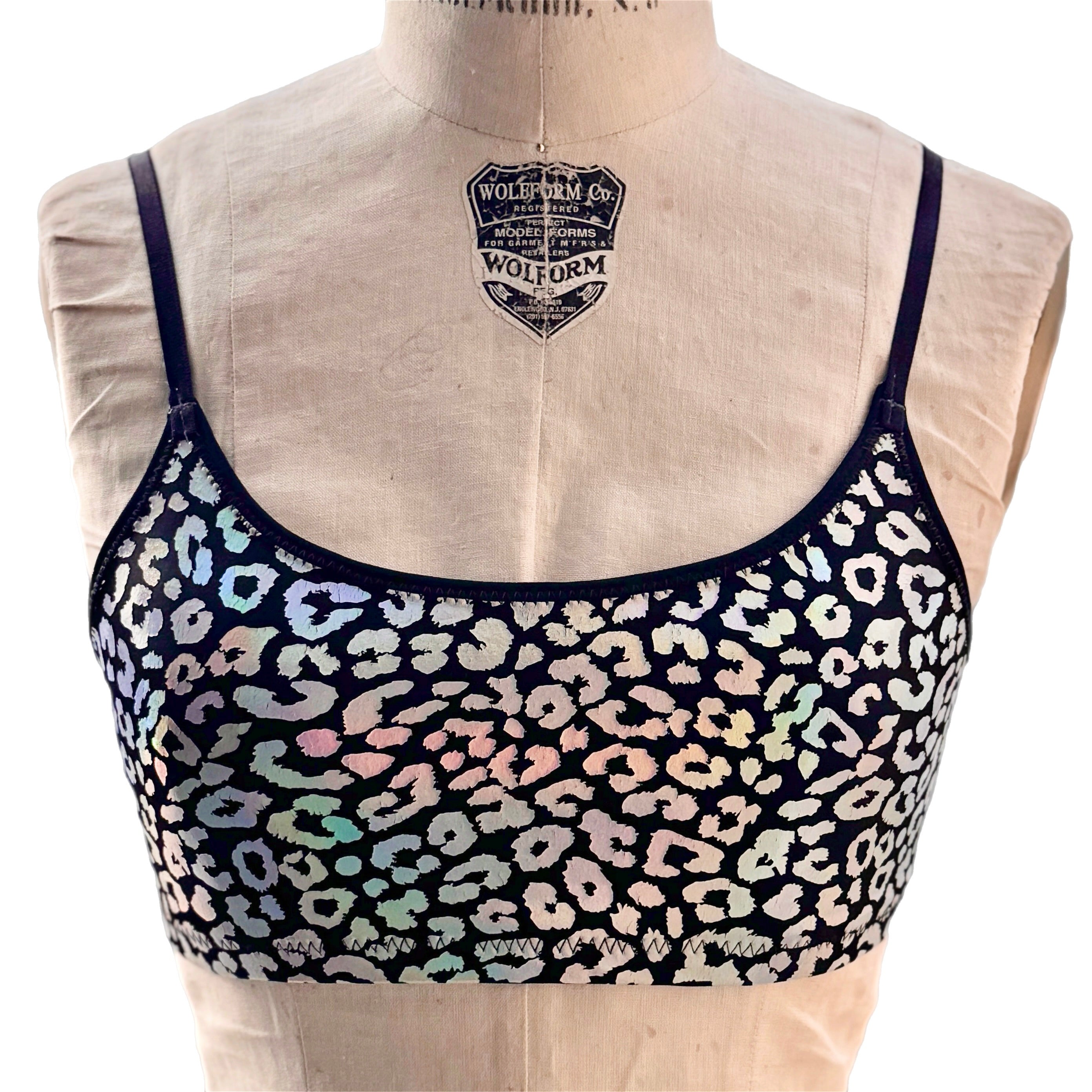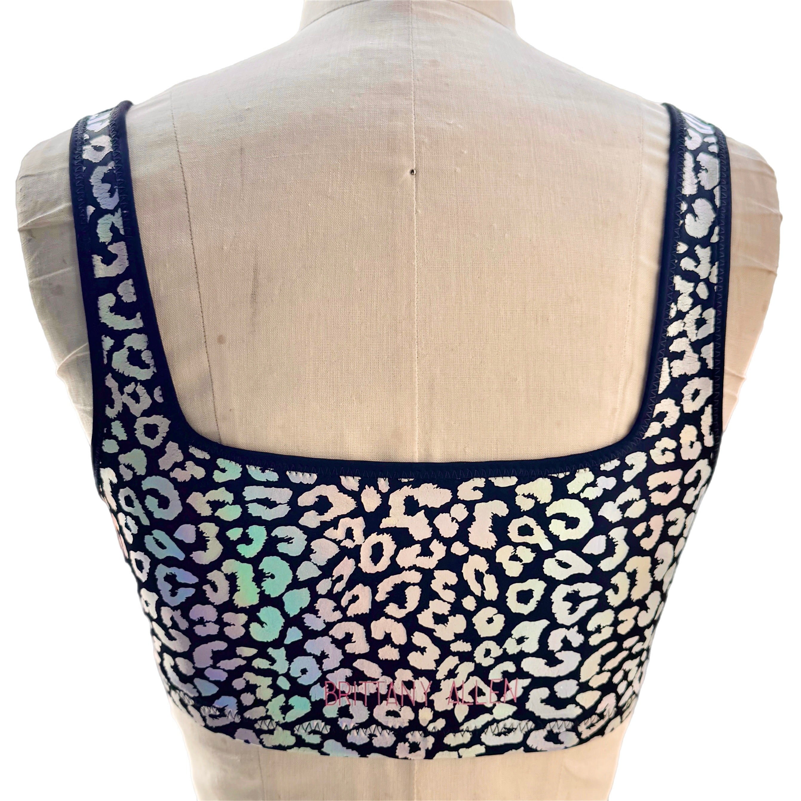 The Mirage Leopard Bra/Tank is a holographic leopard cheetah pattern printed on nylon spandex. This fabric should be treated with a lot of care - the more the fabric stretches, the more the leopard holographic foil print that sits on top of the spandex will crack. The bras feature an encased elastic waistband, fully lined interior, and coverstitching on the band seam to ensure no elastic twists and turns. This bra/top is available in 10 different styles: crew neck bra, scoop neck bra, shoulder bra, square neck bra, micro scoop bra, strappy bralette, long sleeve bra top, cropped sleeveless tank, the racerback tennis tank, and the lined square neck crop tank. Note: We have a limited number of style photos, but all styles will have the same design features. As we create the samples over time, we will load more pics to the site to show all variations of styles. Until then, please refer to photos of other fabrics in the same cuts to see examples.