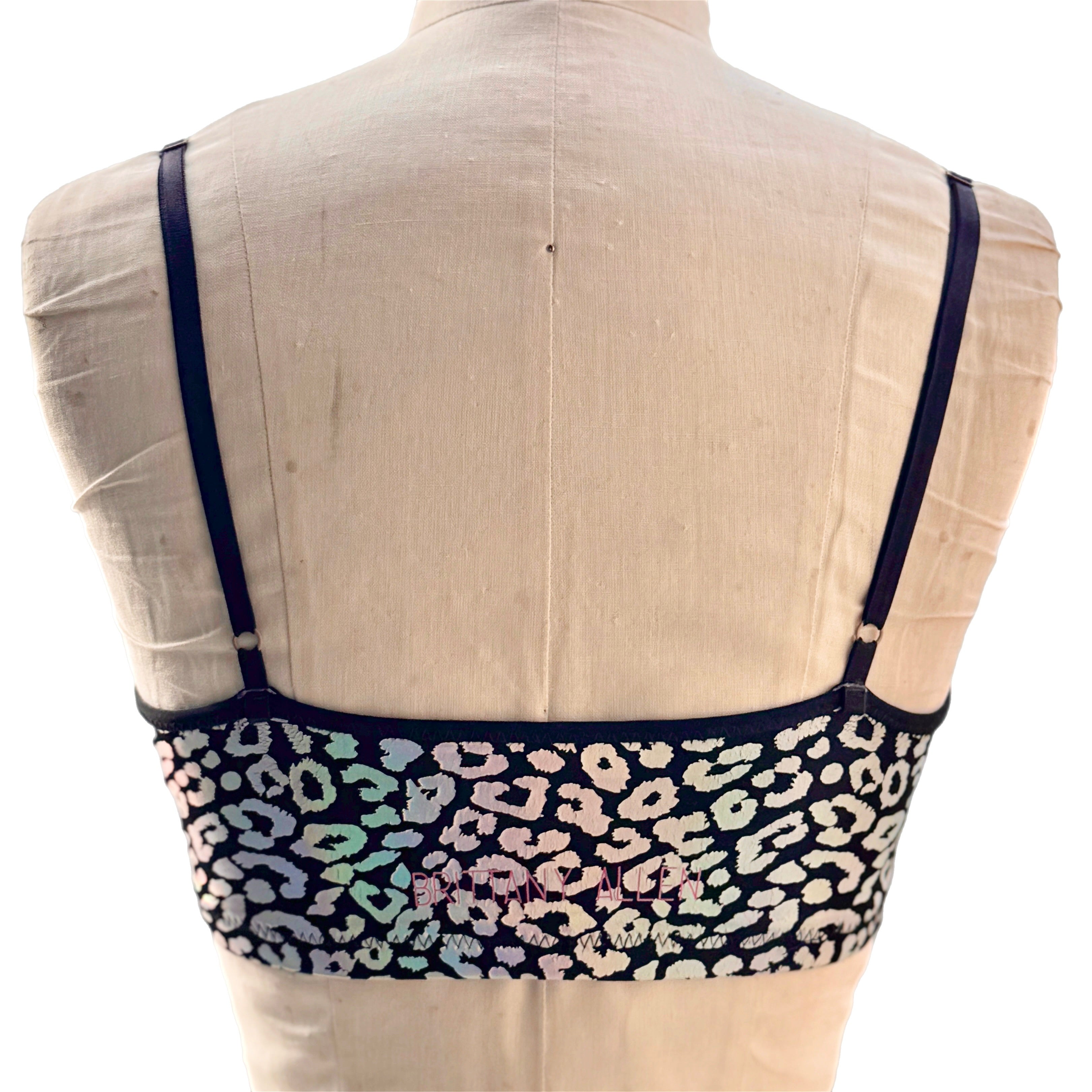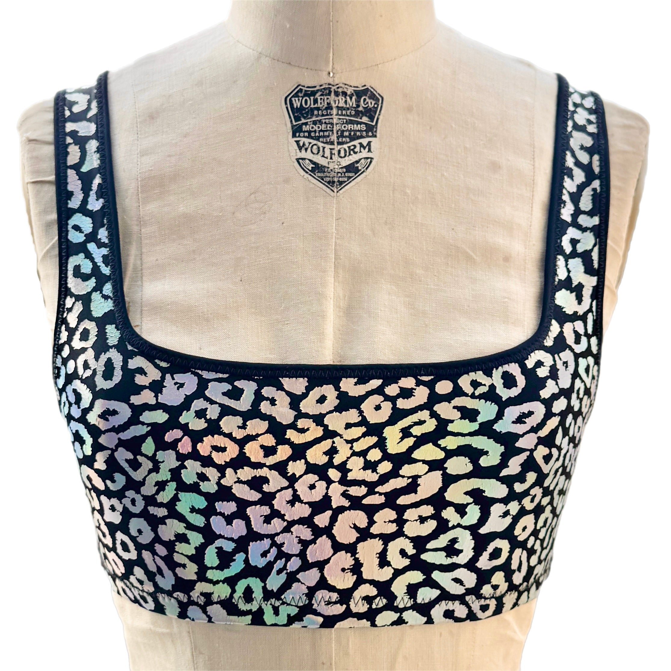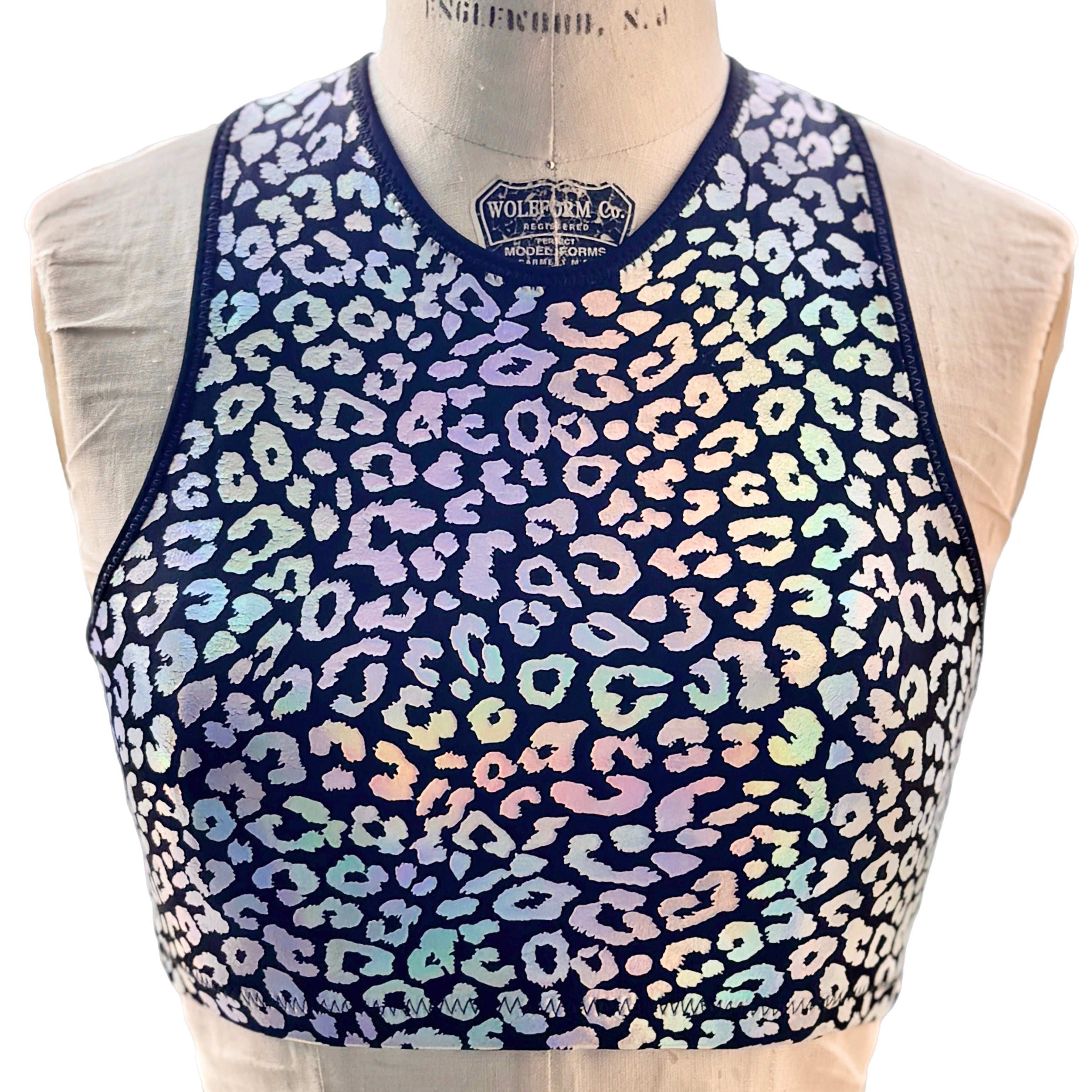 The Mirage Leopard Bra/Tank is a holographic leopard cheetah pattern printed on nylon spandex. This fabric should be treated with a lot of care - the more the fabric stretches, the more the leopard holographic foil print that sits on top of the spandex will crack. The bras feature an encased elastic waistband, fully lined interior, and coverstitching on the band seam to ensure no elastic twists and turns. This bra/top is available in 10 different styles: crew neck bra, scoop neck bra, shoulder bra, square neck bra, micro scoop bra, strappy bralette, long sleeve bra top, cropped sleeveless tank, the racerback tennis tank, and the lined square neck crop tank. Note: We have a limited number of style photos, but all styles will have the same design features. As we create the samples over time, we will load more pics to the site to show all variations of styles. Until then, please refer to photos of other fabrics in the same cuts to see examples.