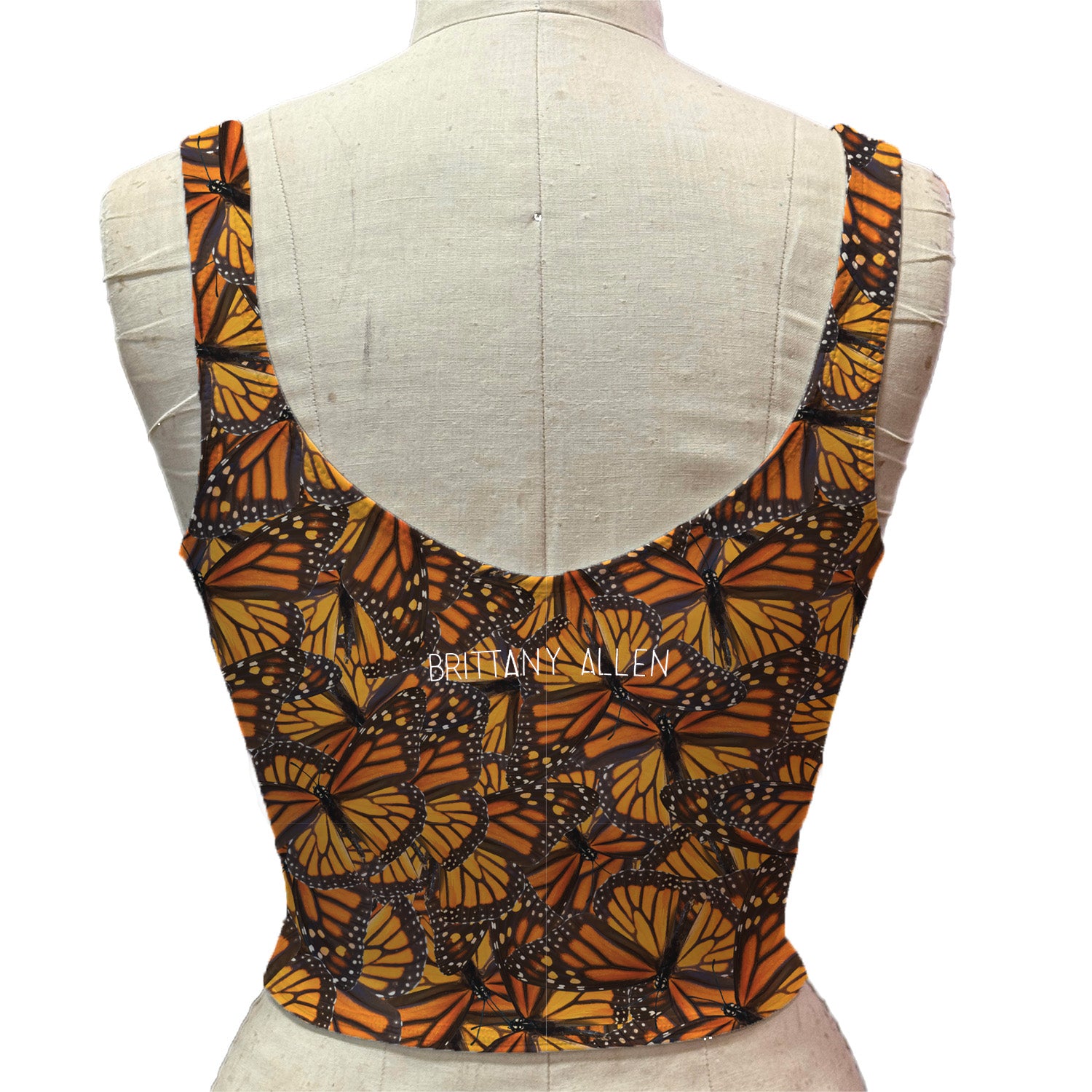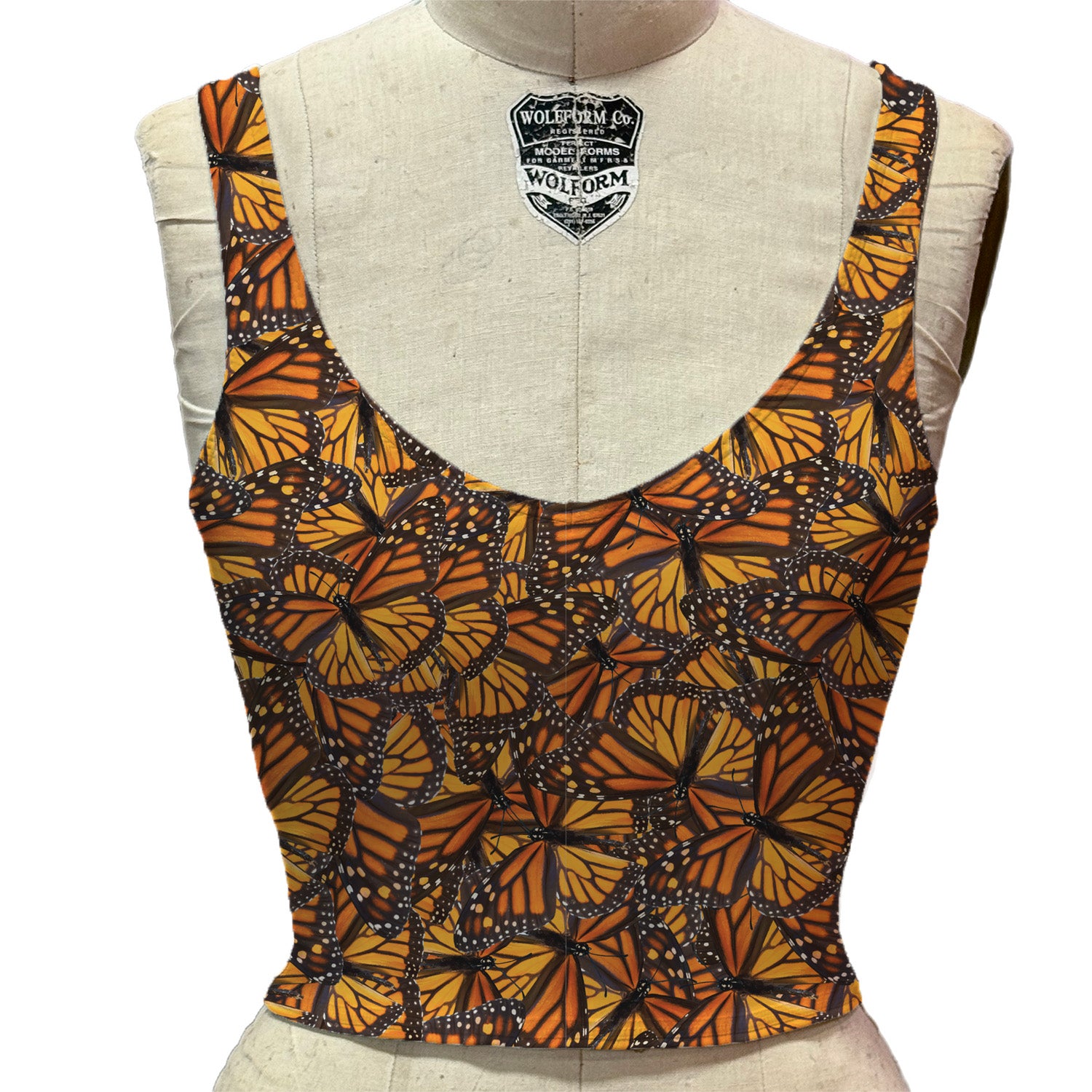 Welcome to the Four Love Club! The Ace V-Neck Tank is a cropped, lined compression tank made of a matte monarch butterfly printed poly spandex. It’s perfect for a stand-out moment on and off the court! Designed to move with you, this fabric transforms any active outfit into something extraordinary. This tank is simply a slip on v-neck tank spandex that hugs the body making it a compression type top. The tank has no shelf bra, but the support is within the compression tightness of the tank itself. Tank is a slip on, and there are no closures.