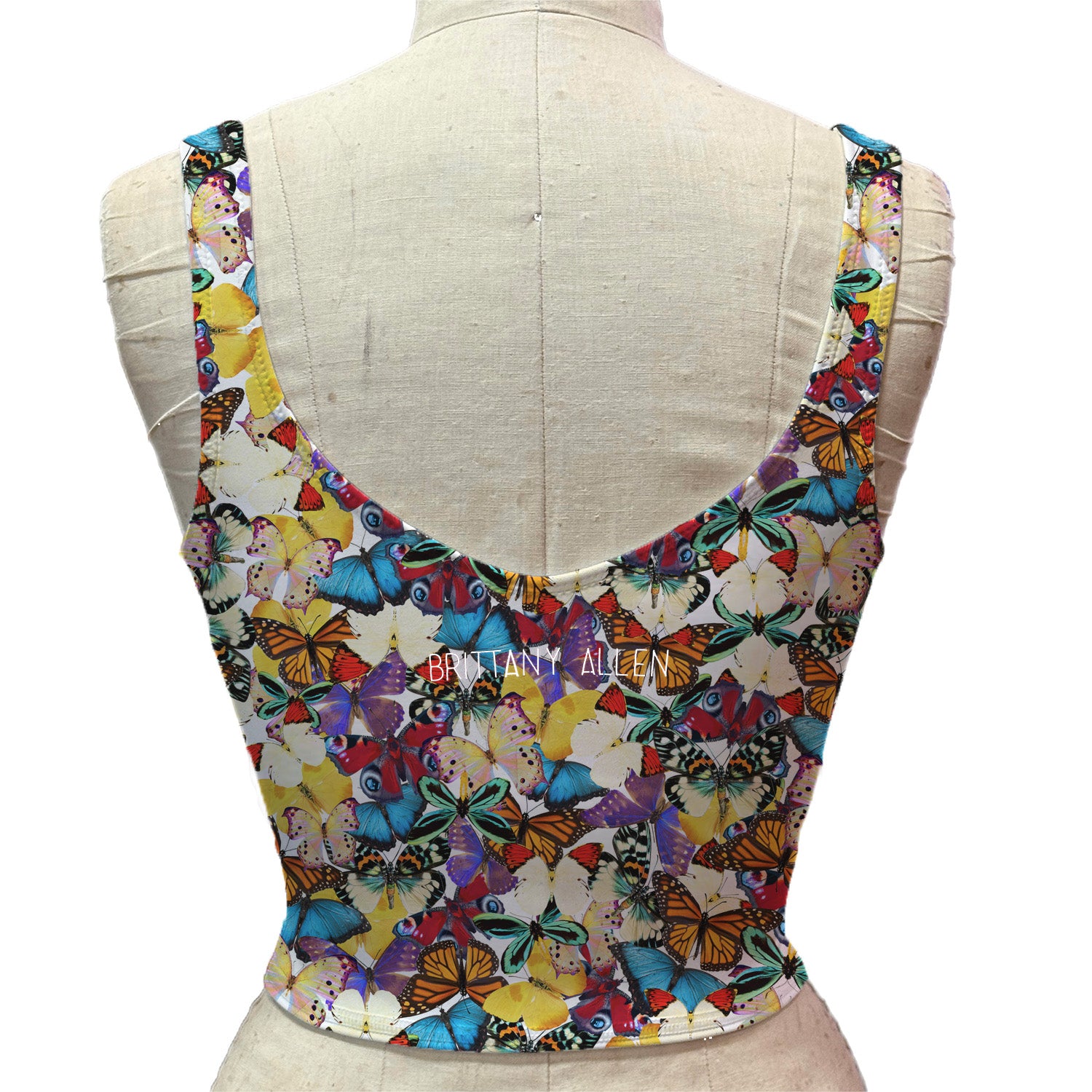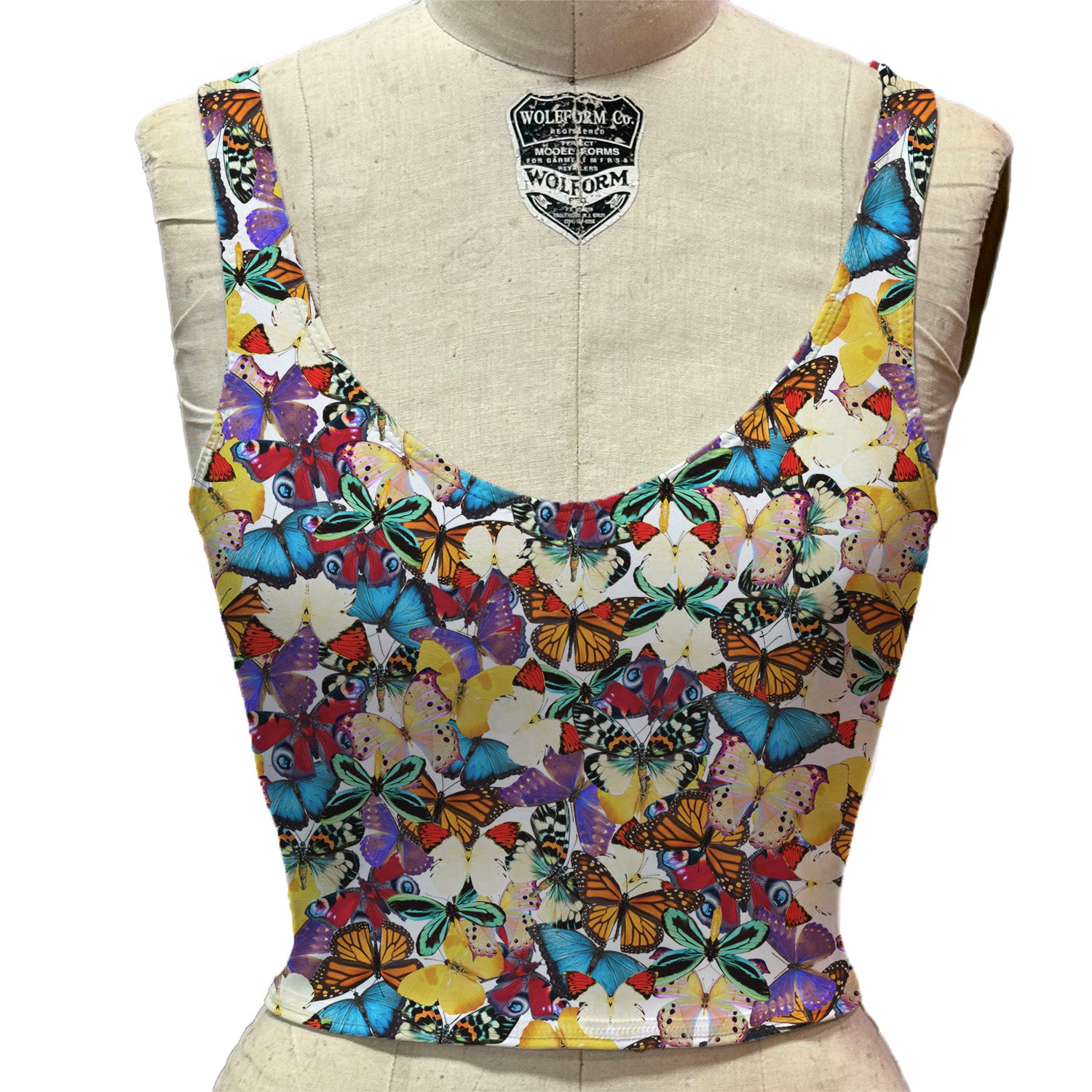 Welcome to the Four Love Club! The Ace V-Neck Tank is a cropped, lined compression tank made of a matte colorful multi-butterfly printed poly spandex. It’s perfect for a stand-out moment on and off the court! Designed to move with you, this fabric transforms any active outfit into something extraordinary. This tank is simply a slip on v-neck tank spandex that hugs the body making it a compression type top. The tank has no shelf bra, but the support is within the compression tightness of the tank itself. Tank is a slip on, and there are no closures.