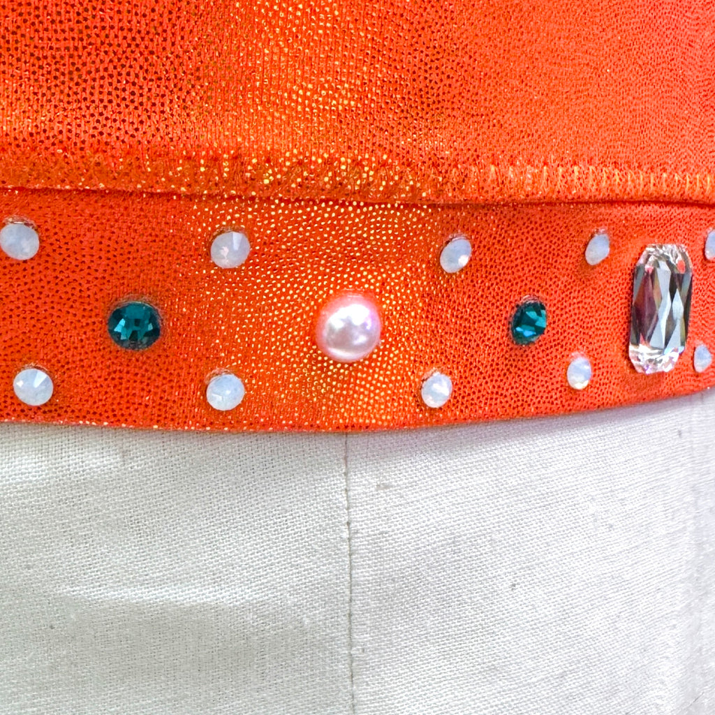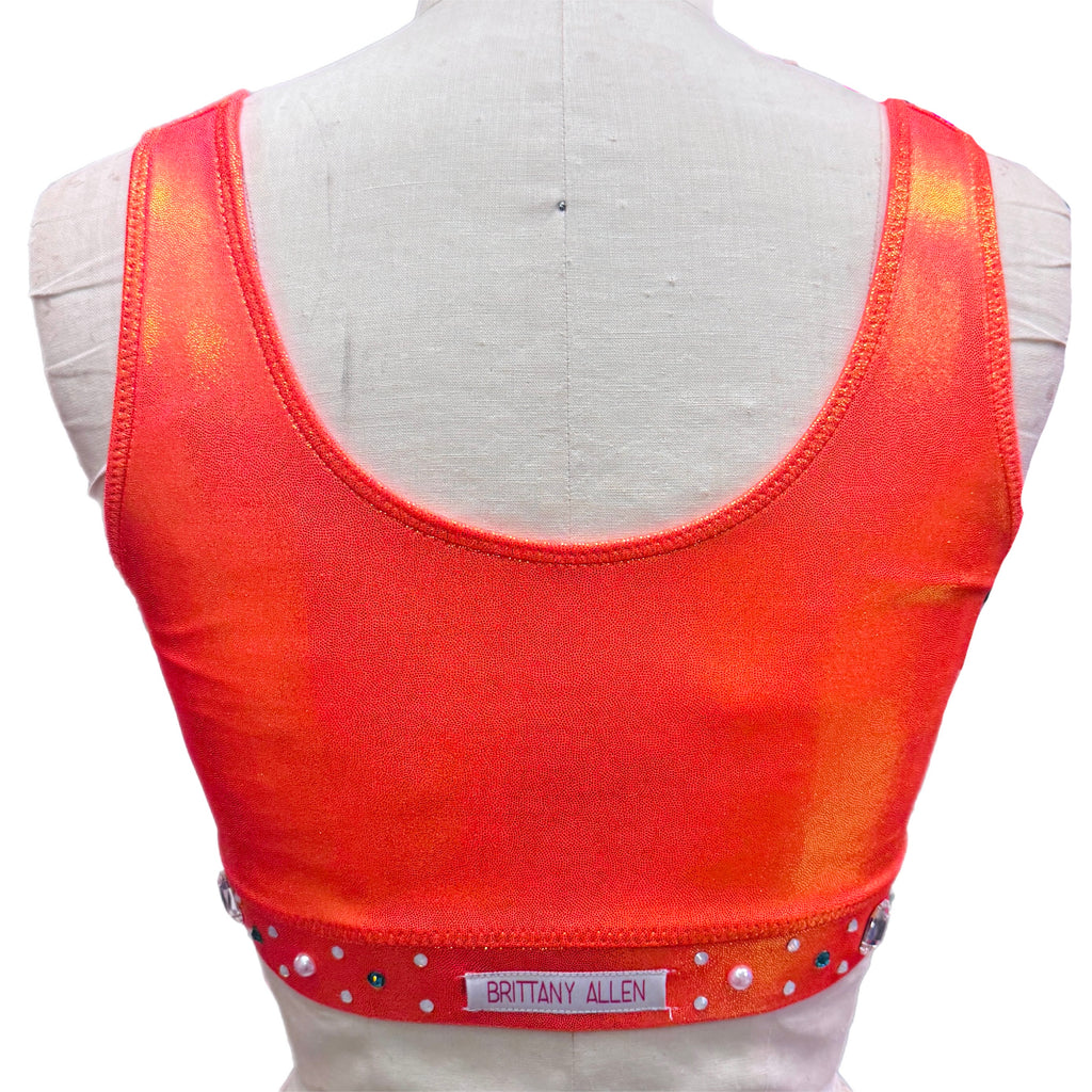 FOR THE SHOWGIRLS: The Opalesque Bra is made of an orange metallic illusion spandex with a gold finish and is specifically designed to wick away moisture while keeping you cool! This bralette features an encased elastic waistband with an assortment of crystals including large emerald cut gems, fully lined interior, and coverstitching on the band seam to ensure no elastic twists and turns. The square neck style is for light/medium impact workouts or daywear - not recommended for runners or high impact movement. THIS GARMENT IS RECOMMENDED TO BE HAND WASHED OR DRY CLEANED ONLY.