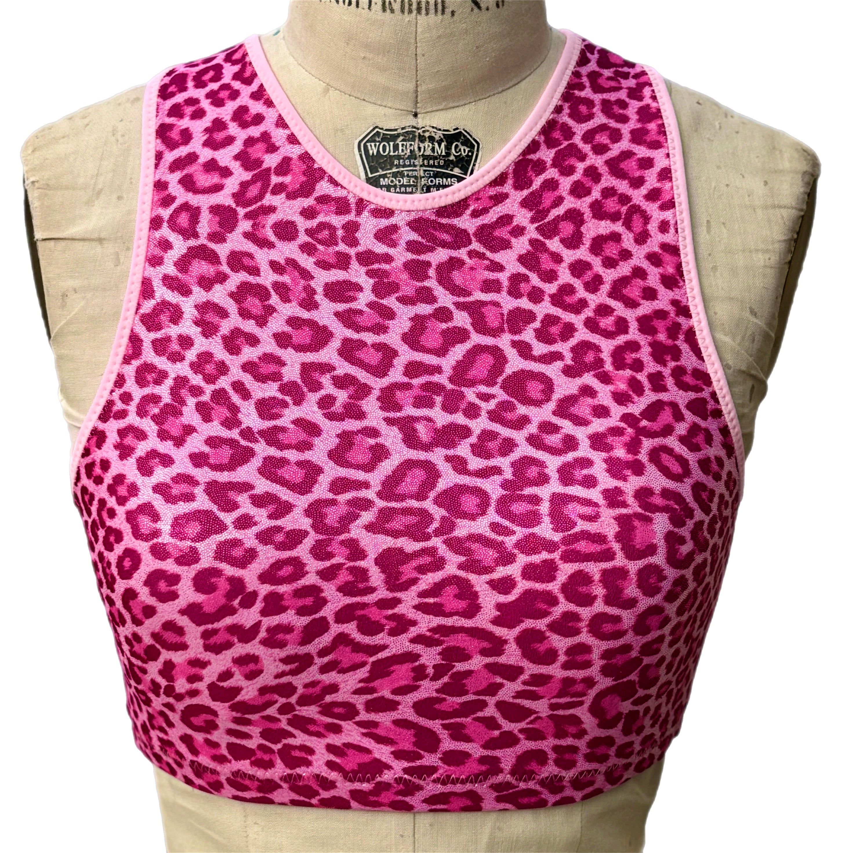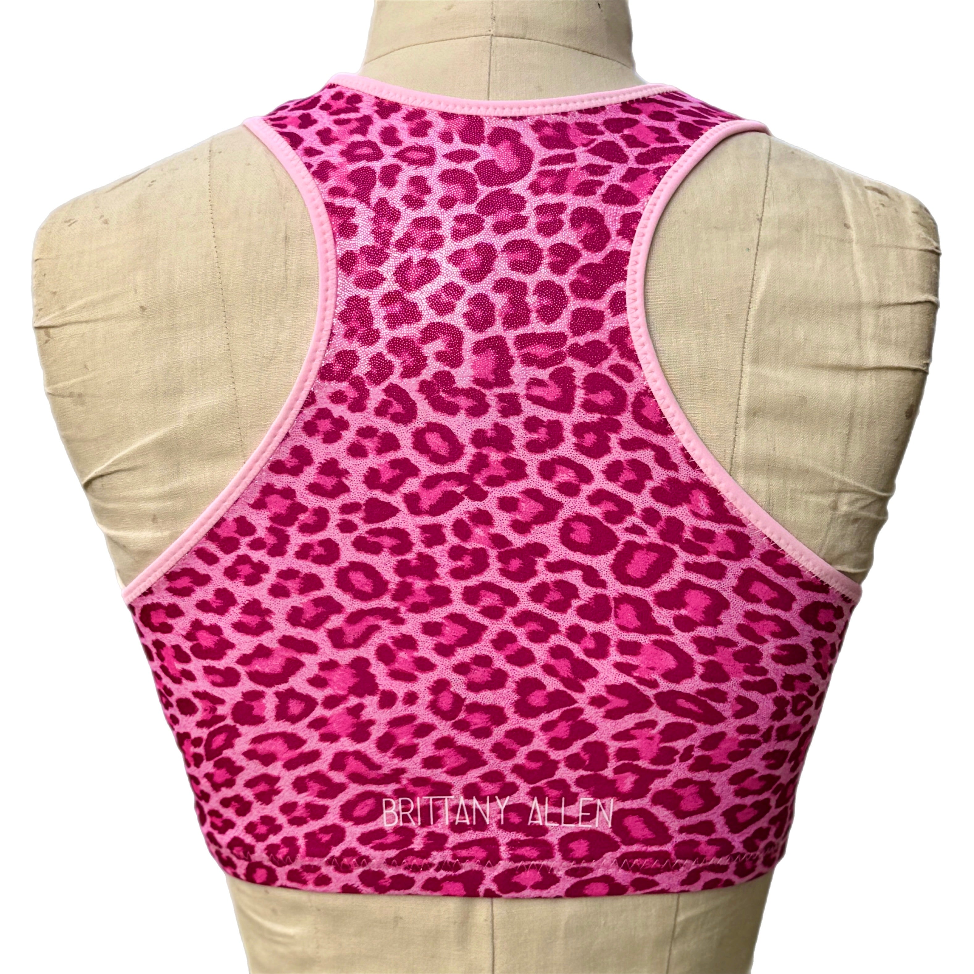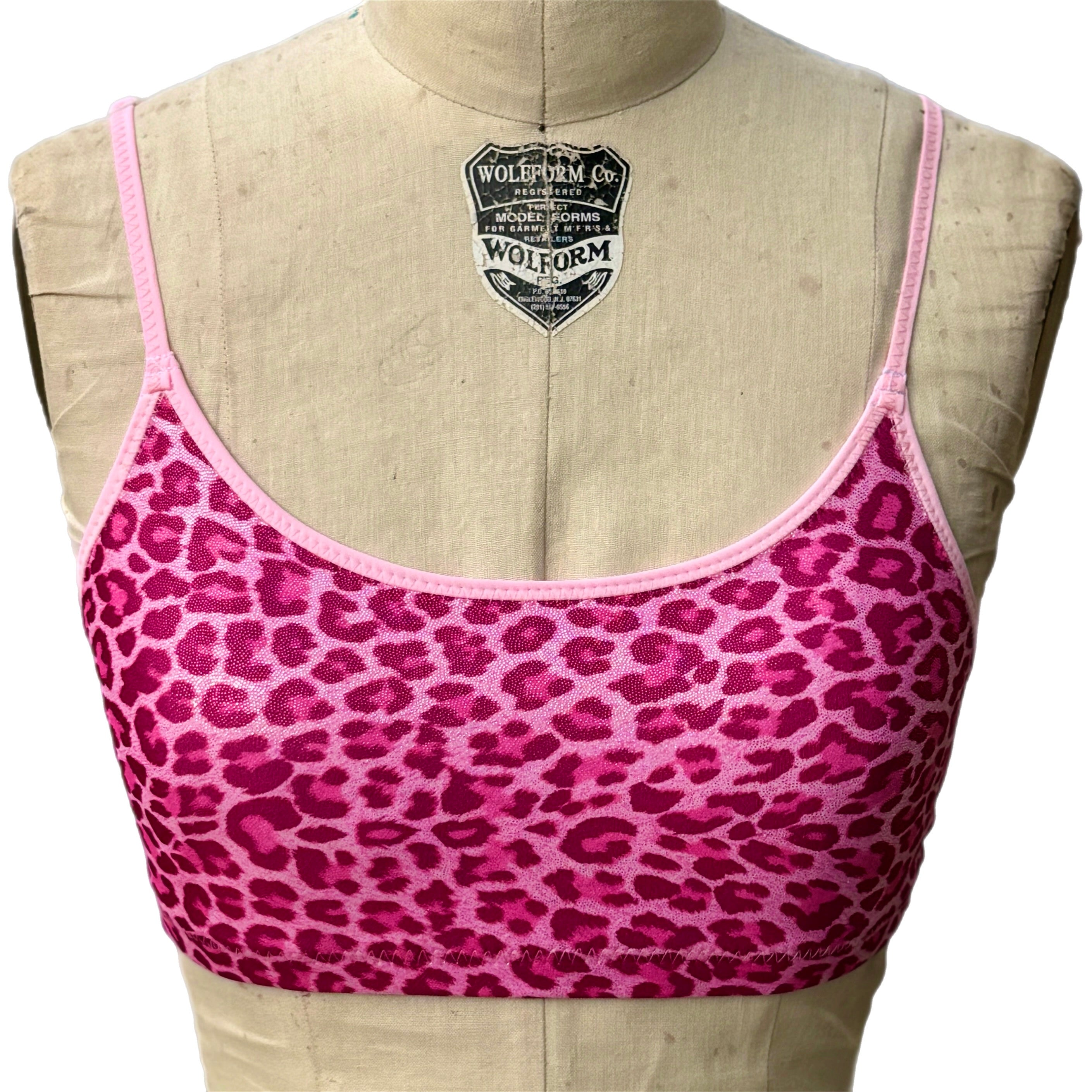 The Purrfect Pink Bra/Tank is a pink leopard pattern printed on nylon spandex topped with a metallic mystique. The fabric is designed to ensure you stay comfortable and dry no matter the activity and is designed to give you the most comfortable experience possible, with fabric that moves with you and maintains breathability and moisture management. The bras feature an encased elastic waistband, fully lined interior, and coverstitching on the band seam to ensure no elastic twists and turns. Our bras/tops are available in 10 different styles: crew neck bra, scoop neck bra, shoulder bra, square neck bra, micro scoop bra, strappy bralette, long sleeve bra top, cropped sleeveless tank, the racerback tennis tank, and the lined square neck crop tank. Note: We have a limited number of style photos, but all styles will have the same design features. As we create the samples over time, we will load more pics to the site to show all variations of styles. Until then, please refer to photos of other fabrics in the same cuts to see examples.