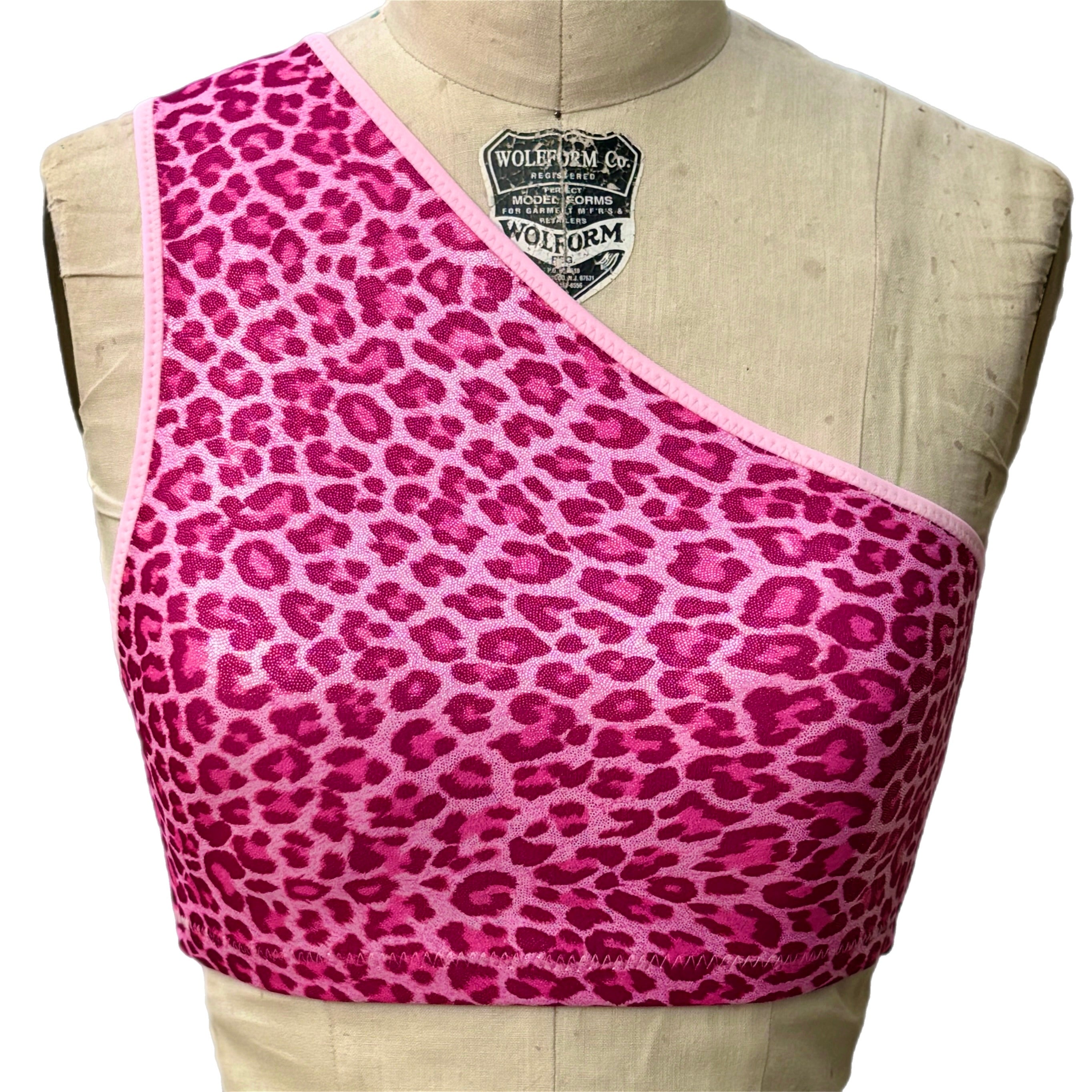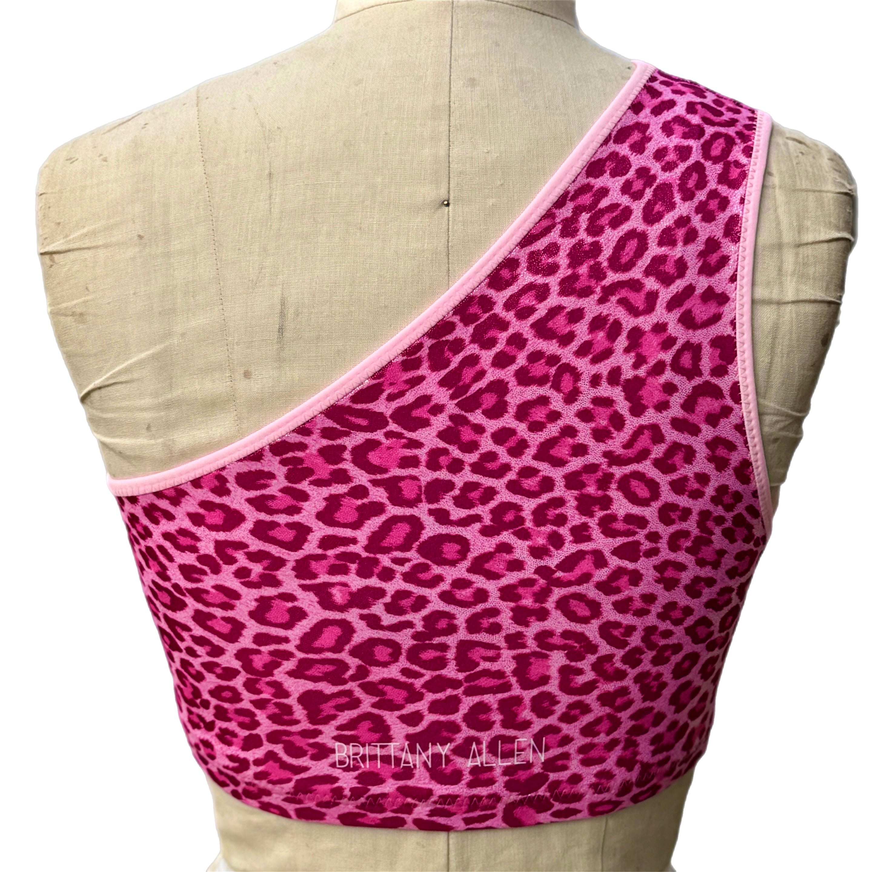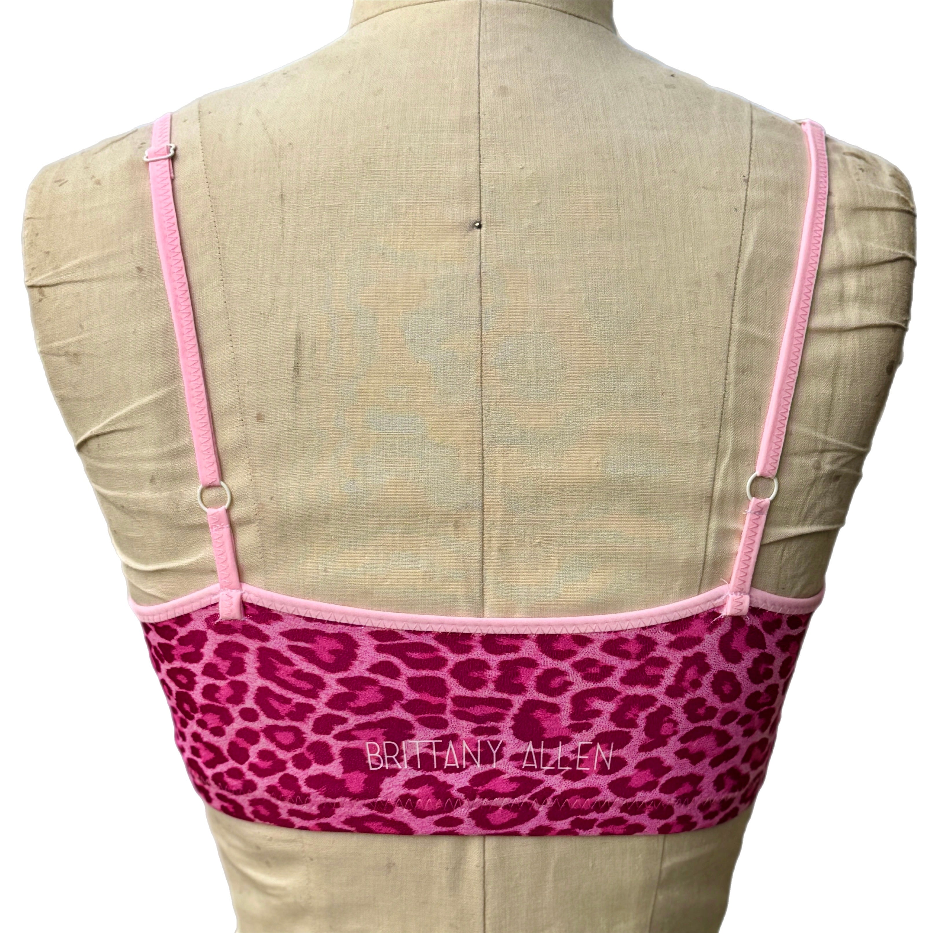 The Purrfect Pink Bra/Tank is a pink leopard pattern printed on nylon spandex topped with a metallic mystique. The fabric is designed to ensure you stay comfortable and dry no matter the activity and is designed to give you the most comfortable experience possible, with fabric that moves with you and maintains breathability and moisture management. The bras feature an encased elastic waistband, fully lined interior, and coverstitching on the band seam to ensure no elastic twists and turns. Our bras/tops are available in 10 different styles: crew neck bra, scoop neck bra, shoulder bra, square neck bra, micro scoop bra, strappy bralette, long sleeve bra top, cropped sleeveless tank, the racerback tennis tank, and the lined square neck crop tank. Note: We have a limited number of style photos, but all styles will have the same design features. As we create the samples over time, we will load more pics to the site to show all variations of styles. Until then, please refer to photos of other fabrics in the same cuts to see examples.