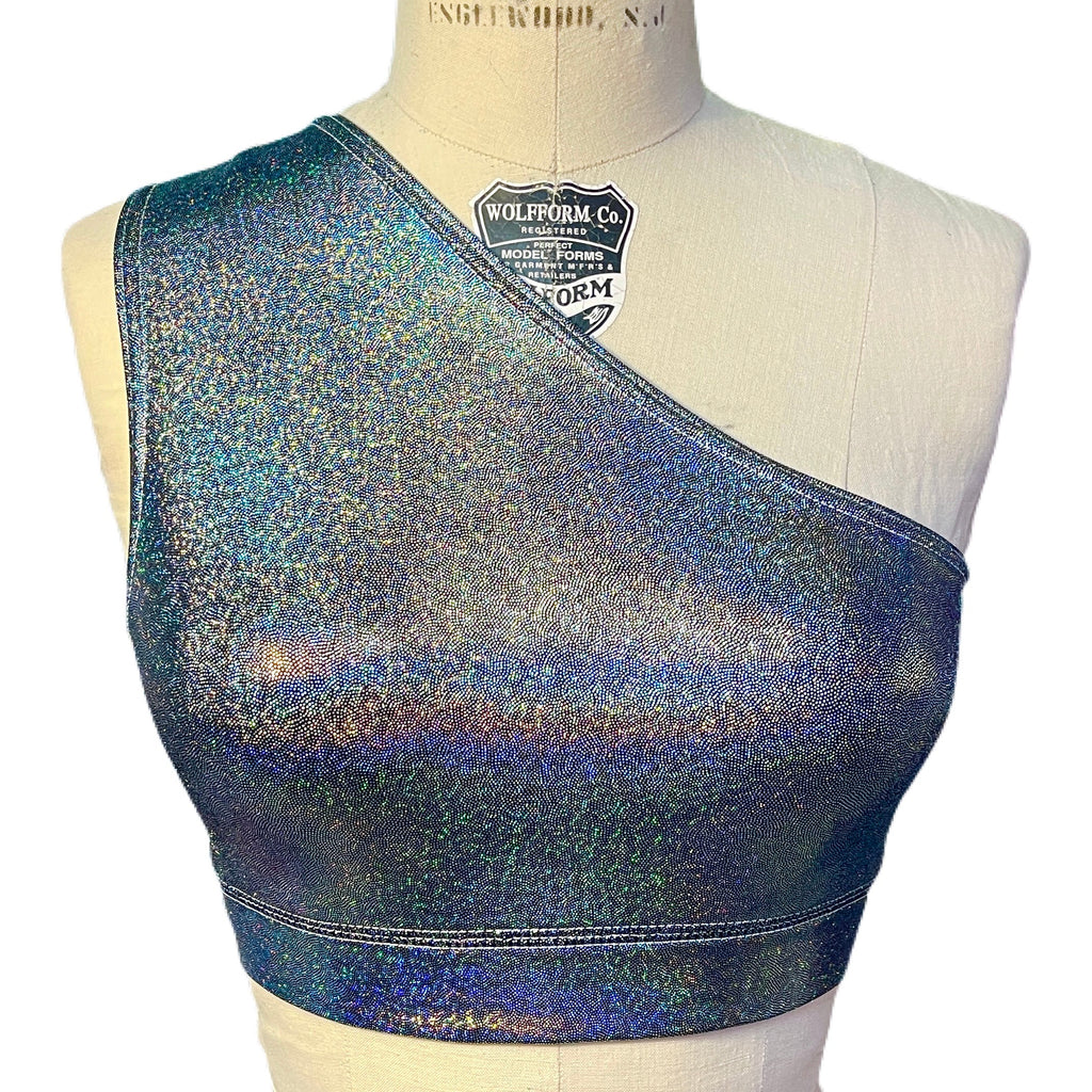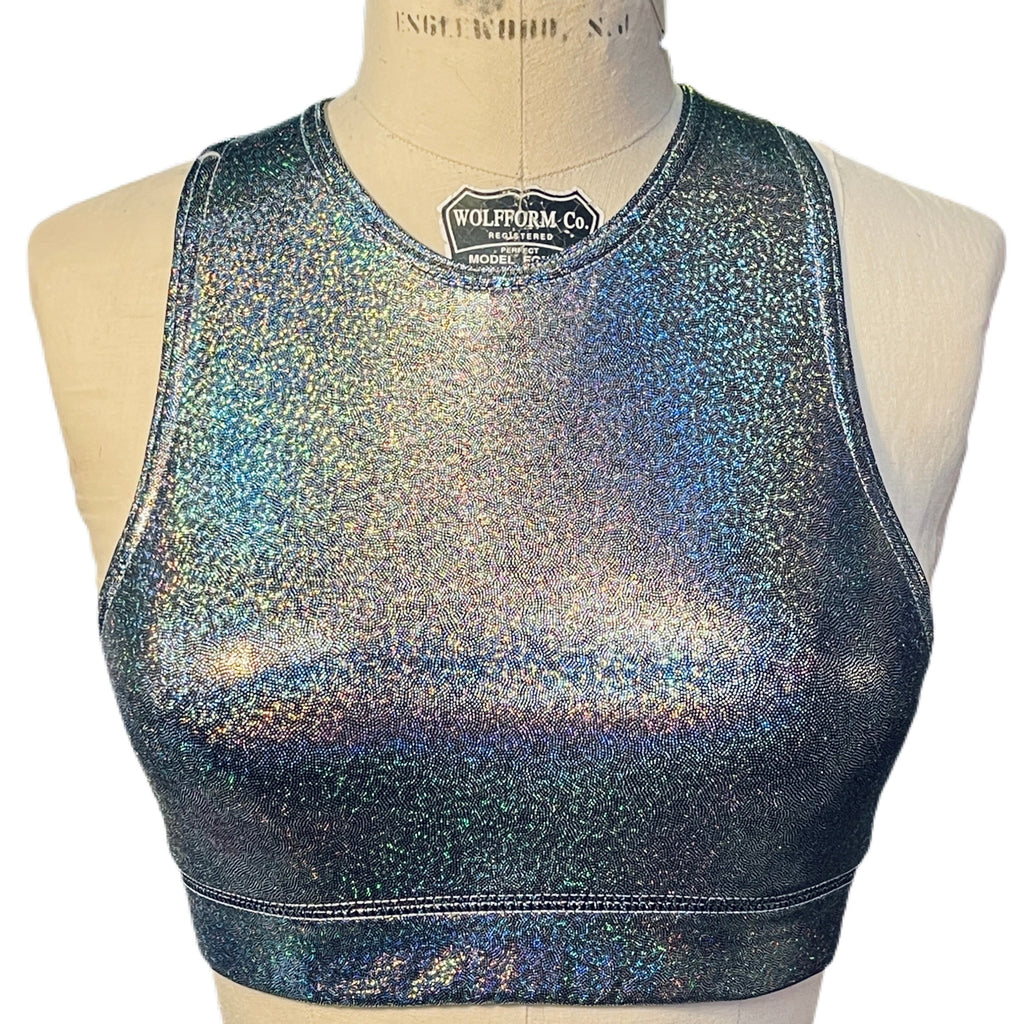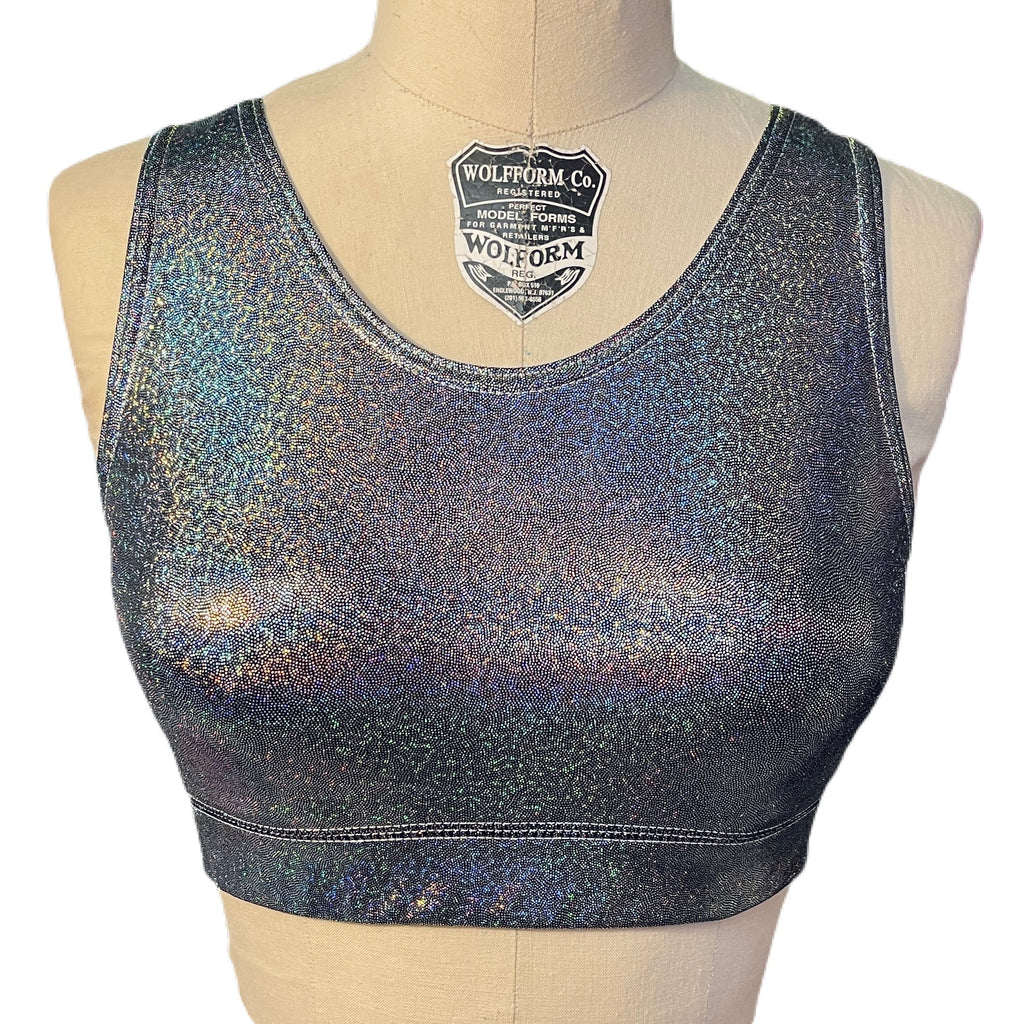 The Galactic Bra is made with a holograohic foiled nylon spandex. The bra comes in 7 different cuts, has an encased elastic waistband, fully lined interior, and coverstitching on the band seam to ensure no elastic twists and turns.