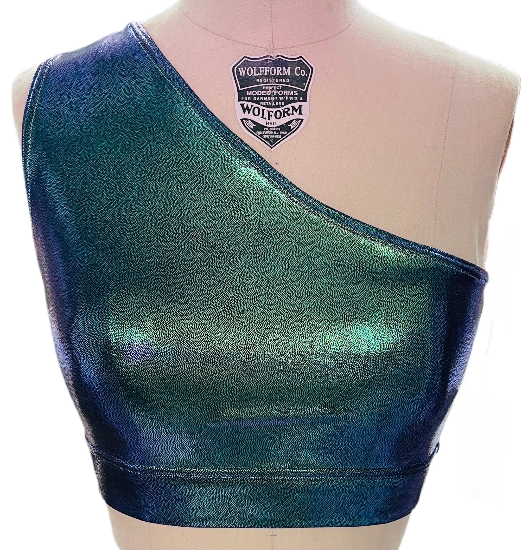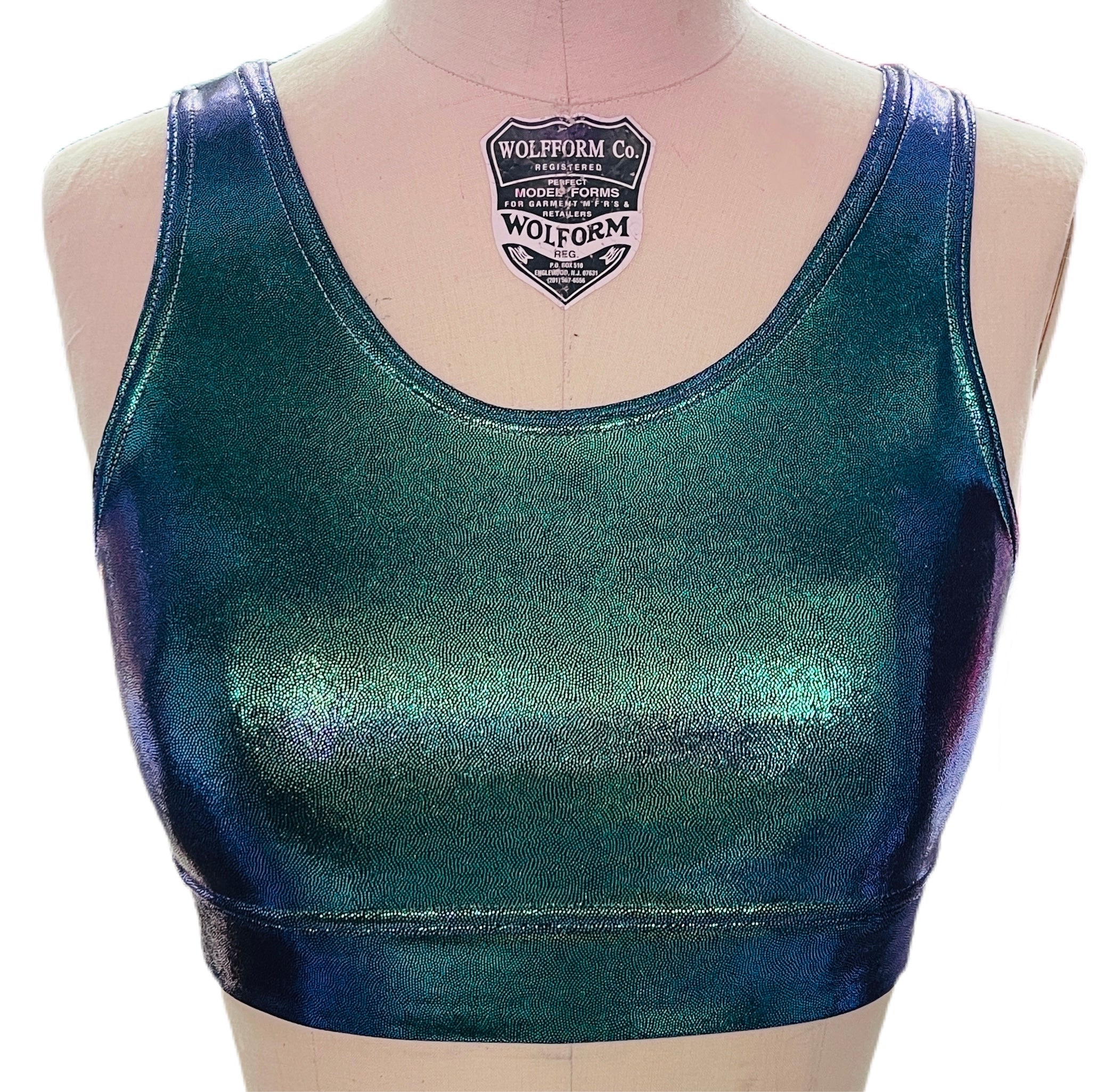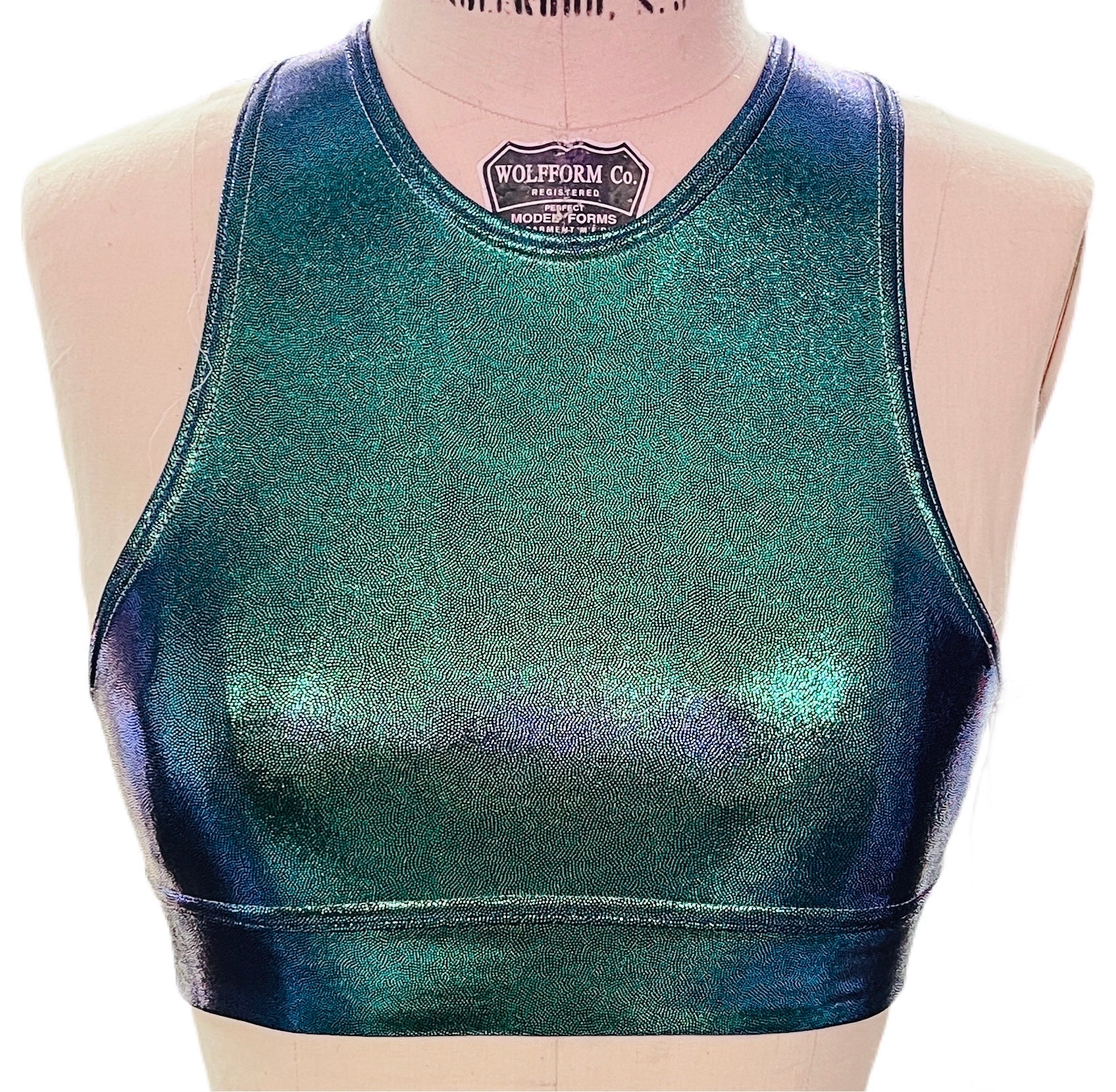 The Mermaid Bra is made with a scarb foiled nylon spandex. The bra comes in 7 different cuts, has an encased elastic waistband, fully lined interior, and coverstitching on the band seam to ensure no elastic twists and turns.